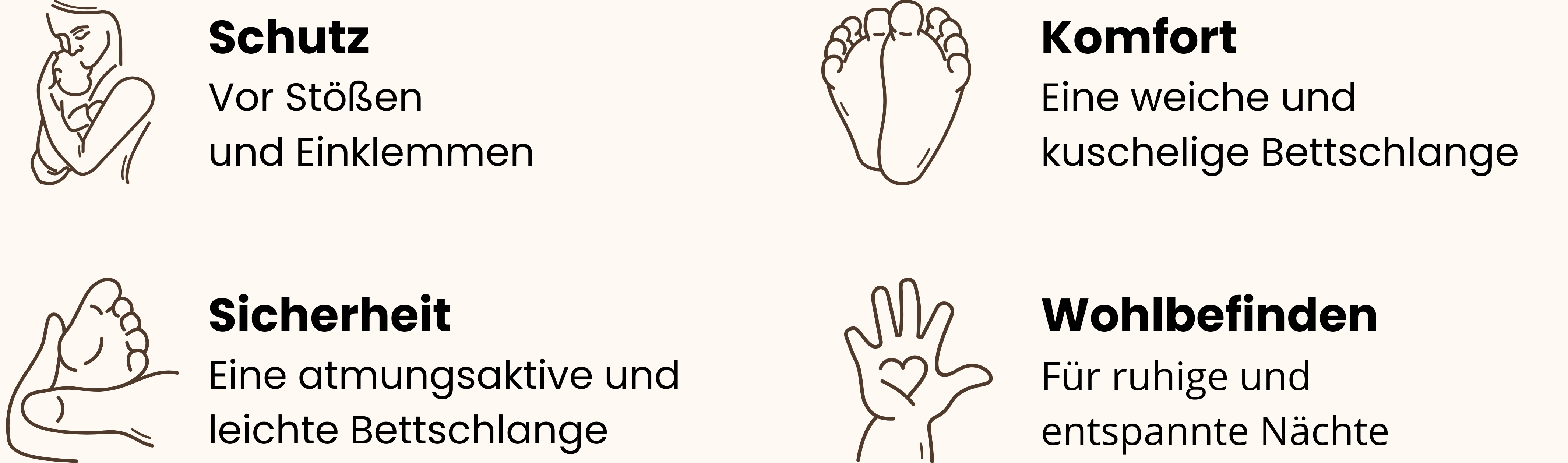 Die Bettschlange ist ein Dekorations- und Komfortzubehör, das dazu dient, den Raum im Bett zu verkleinern oder seitlich weich abzufedern – nicht als Schutz vor Stößen, Quetschungen oder Stürzen.